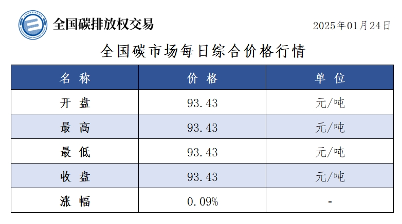 今日全国碳市场综合价格行情为: 开盘价93.43元/吨,最高价93.43元/吨,最低价93.43元/吨,收盘价93.43元/吨,收盘价较前一日上涨0.09%。