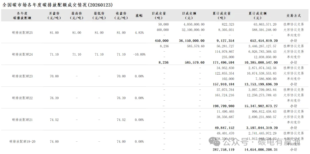 2026年1月1日至1月23日,全国碳市场碳排放配额成交量10,072,863吨,成交额727,158,231.80元。