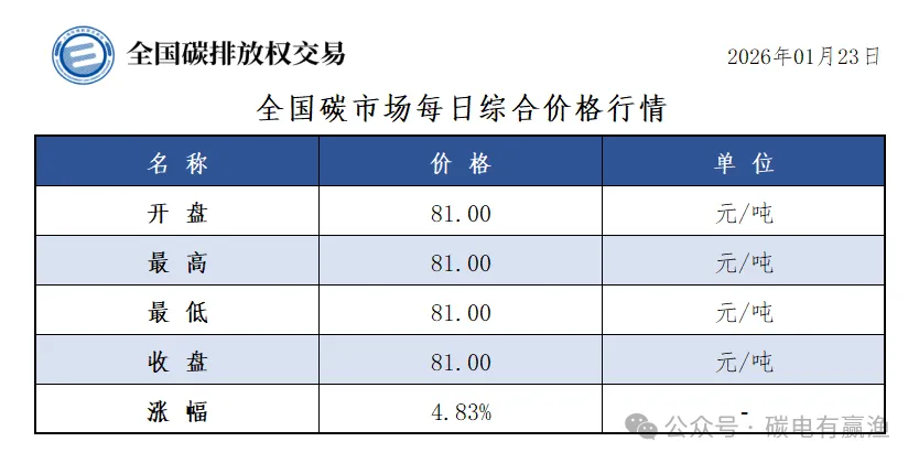 今日全国碳市场综合价格行情为:开盘价81.00元/吨,最高价81.00元/吨,最低价81.00元/吨,收盘价81.00元/吨,收盘价较前一日上涨4.83%。