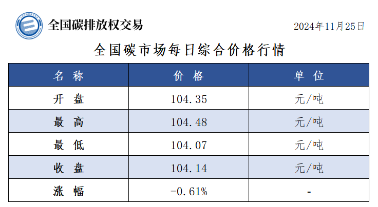 今日全国碳市场综合价格行情为: 开盘价104.35元/吨,最高价104.48元/吨,最低价104.07元/吨,收盘价104.14元/吨,收盘价较前一日下跌0.61%。