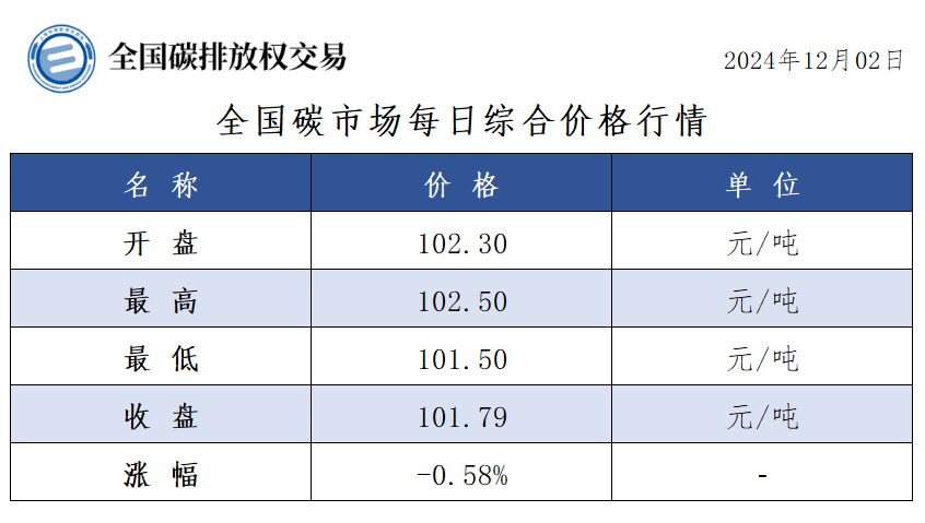 今日全国碳市场综合价格行情为: 开盘价102.30元/吨,最高价102.50元/吨,最低价101.50元/吨,收盘价101.79元/吨,收盘价较前一日下跌0.58%。