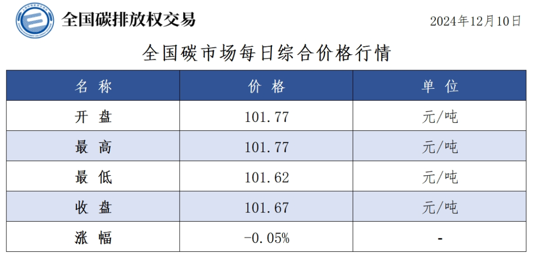 今日全国碳市场综合价格行情为: 开盘价101.77元/吨,最高价101.77元/吨,最低价101.62元/吨,收盘价101.67元/吨,收盘价较前一日下跌0.05%。