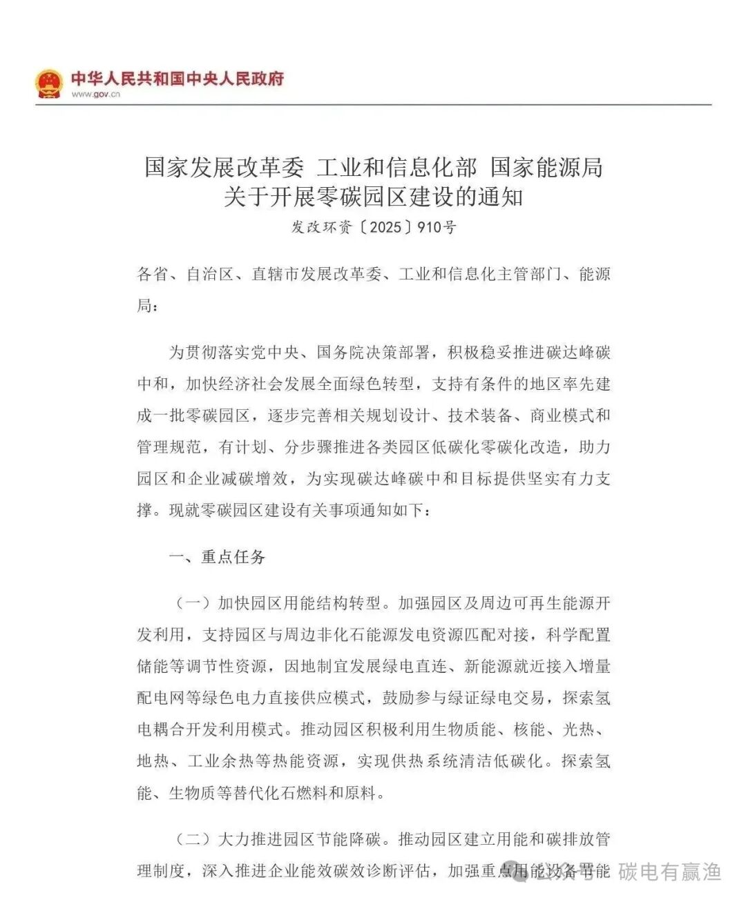 《关于开展零碳园区建设的通知》(发改环资〔2025〕910号)-节选