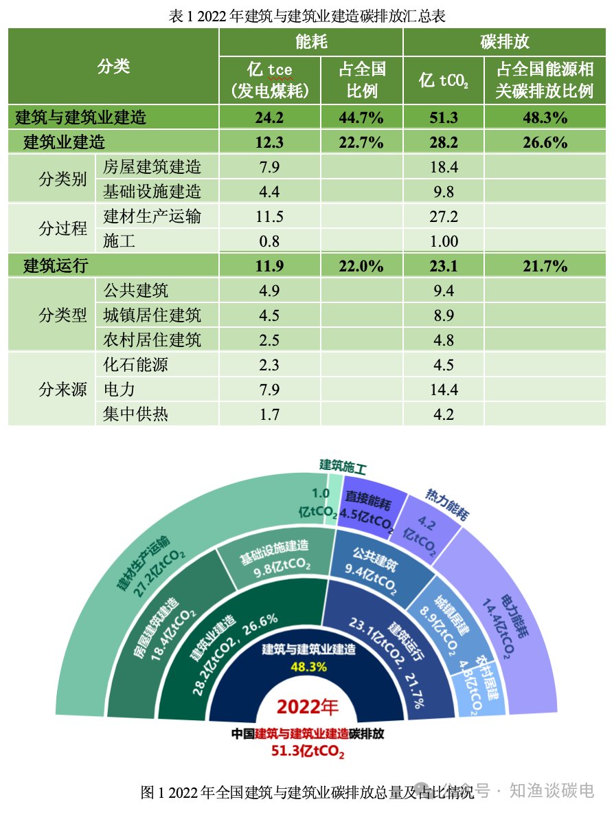 2022年全国建筑与建筑业建造碳排放总量51.3 亿tCO2,占全国能源相关碳排放48.3%