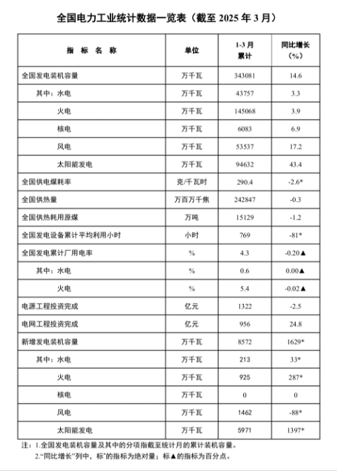 截至3月底,全国累计发电装机容量34.3亿千瓦,同比增长14.6%。其中,太阳能发电装机容量9.5亿千瓦,同比增长43.4%;风电装机容量5.4亿千瓦,同比增长17.2%。